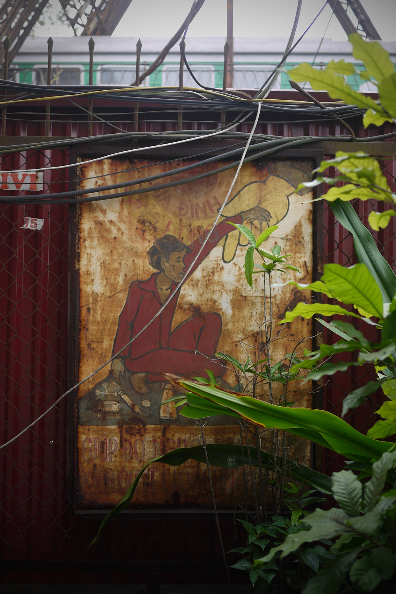 i found my way to a clearing near the river where an expanse of jungle-like gardens were growing. the long bien bridge, an early 20th century French monstrosity, was several hundred meters north, stretching into the distance with vehicles and pedestrians hurrying across. from there i turned toward the bridge and found my way into a small alley way. just before turning the corner, i came across a worn mural advertising treatment for heroin addicts. i took a photo as a train rumbled across the bridge overhead.